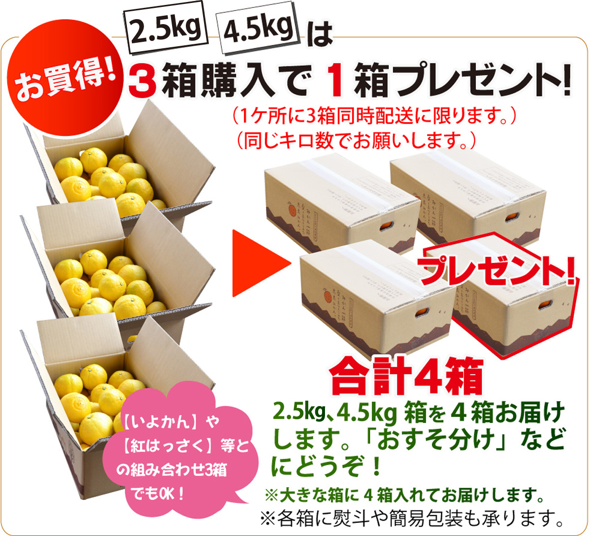 1配送(1ヶ所へお届け)→3kg、4.5kg は3箱で1箱プレゼント(合計4箱)までは300円です。